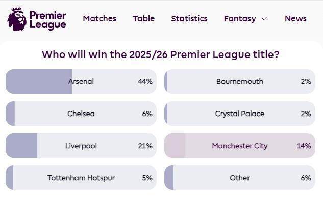10月19日讯 本赛季英超战至第8轮,已出现三支不同的领头羊:曼城、利物浦以及现在的阿森纳。而且前8名球队间只有6分的分差。英超官网表示,这可能是英超有史以来最精彩的冠军争夺战之一。他们发起了“谁能最终夺冠?”的球迷投票,枪手最被看好,他们的得票率高达44%。红军曼城紧随其后。Whoscored列双红会本赛季评分最高阵:埃基蒂克领衔,B费在列