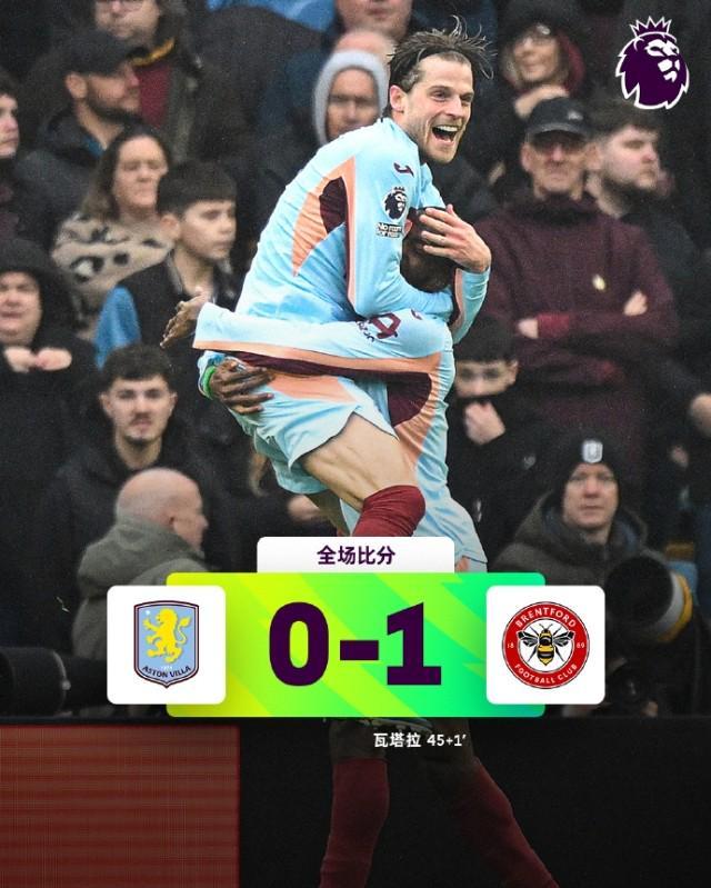 英超24轮,阿斯顿维拉主场0比1不敌布伦特福德。第42分钟,沙德报复犯规,踩踏卡什要害部位被红牌罚下场,布伦特福德10人作战。 ​​​3分钟后,瓦塔拉禁区内拿球,小角度爆射破门。下半场维拉狂射20脚(上半场7射)无功而返,“小蜜蜂”输人不输球。维拉输球后落后榜首阿森纳7分,领先身后曼联5分。