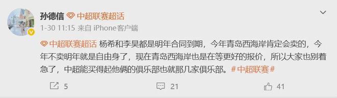 根据媒体人的透露,青岛西海岸队打算在今年将李昊卖出,因为李昊与俱乐部的合同明年到期,今年不卖,明年就会变成自由之身。西海岸队现在在等一个好的报价。
