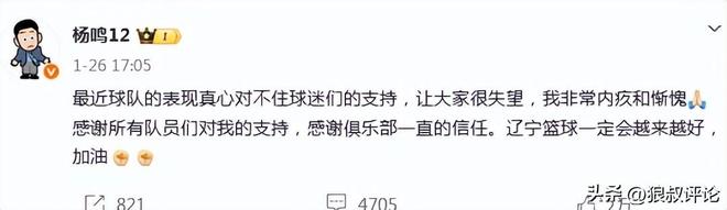 杨鸣当时更新社媒发文表示:最近球队的表现真心对不住球迷们的支持,让大家很失望,我非常内疚和惭愧,感谢所有队员们对我的支持,感谢俱乐部一直的信任。辽宁篮球一定会越来越好。
