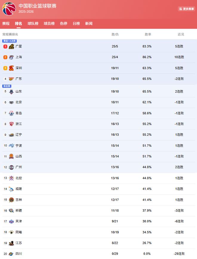 广厦队目前25胜5负,在多赛一轮的情况下,积分领先25胜4负的上海队,来到了第1位,不过2队第1名的争夺非常激烈,上海虽然那豪取10连胜,打的非常强势,但想甩开广厦,却也没有那么容易!