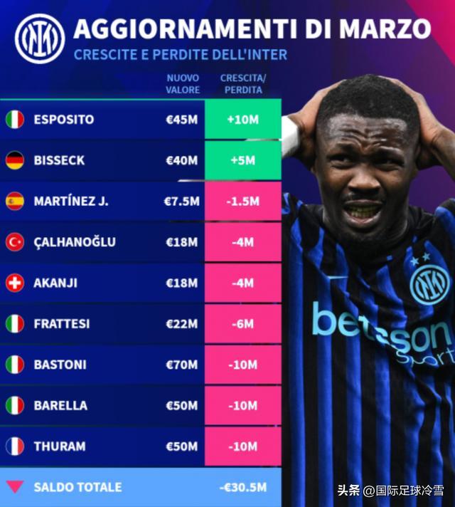 虽然蓝黑军的身价总值6.668亿欧元,仍然是意甲第一。但以国米自身为参照物,蓝黑军总身价下滑了3050万欧元。