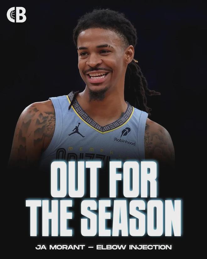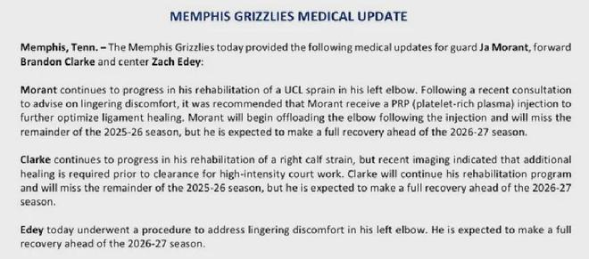 灰熊官方宣布:莫兰特因左肘尺侧副韧带(UCL)扭伤提前结束本赛季征程,预计26-27赛季开始前完成康复......